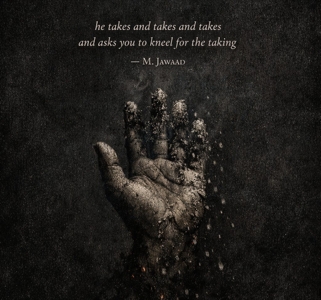 You press your foreheads to the ground for this. You fast and you pray and you prostrate yourselves before the one who looked at everything you loved and decided it was his to reclaim, his to redistribute, his to pull from your chest while you were still breathing and still hoping and still building your small ridiculous human life around something real — and you call this devotion.
