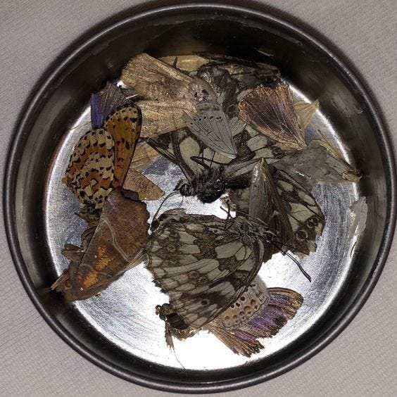 My shoe catches another butt. Drags it a few inches. Lets it go.